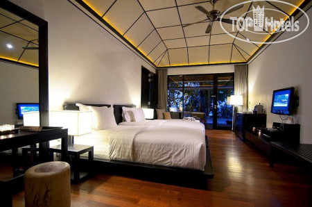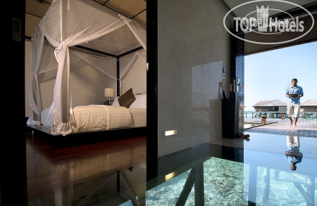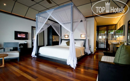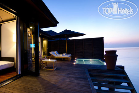 Deluxe Water villa. Выходят на сторону заката и рассвета. С закатной стороны кораллы с живностью, с рассвета свал. Все с бассейнами. Возраст чувствуется по мебели, но не критично. Можно доставлять бортики на террасе. Мало света в Ванной - нет зеркала для бритья с подсветкой, но это если придираться.